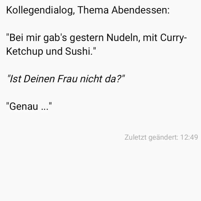 Das größte Glück für einen Mann, ist eine Frau die kochen kann … wenn sie denn da ist. Kollegendialog im Büro, Thema Abendessen: „Bei mir gab’s gestern Nudeln mit Curry-Ketchup und Sushi.“ „Ist Deine Frau nicht da?“ „Genau …“