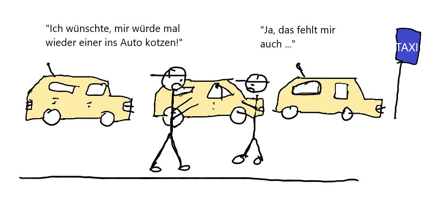 Ein breitgefächertes Allgemeinwissen ist in diesem Beruf von Vorteil. Leider gehört auch das Reinigen von PKW-Innenräumen dazu. Aufgrund der Corona-Pandemie und nicht stattfindenden kulturellen Veranstaltungen mit anschließendem Endsuff, ist die Zahl der Fahrgäste stark rückläufig (rückläufig – denkt mal drüber nach). Aktuell herrscht aber eine Taxifahrer-Fahrgast-Allokation. Seit Corona gibt es einen Überschuss an topausgebildeten Taxifahrern,„Unterhalten sich zwei Kulturwisschenschaftler …“ weiterlesen