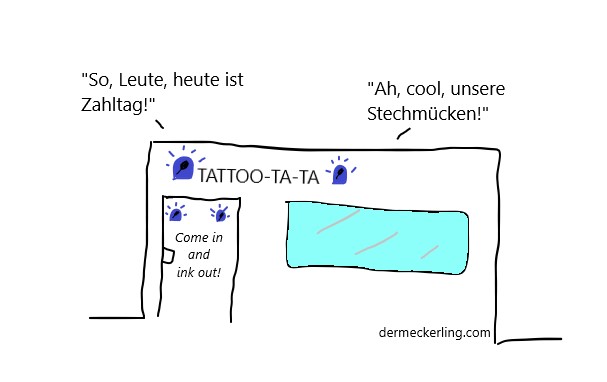 Hätte ich nen Tattoostudio, ich würd’s „TATTOO-TA-TA“ nennen und meinen Angestellten monatlich ihre Stechmücken auszahlen.